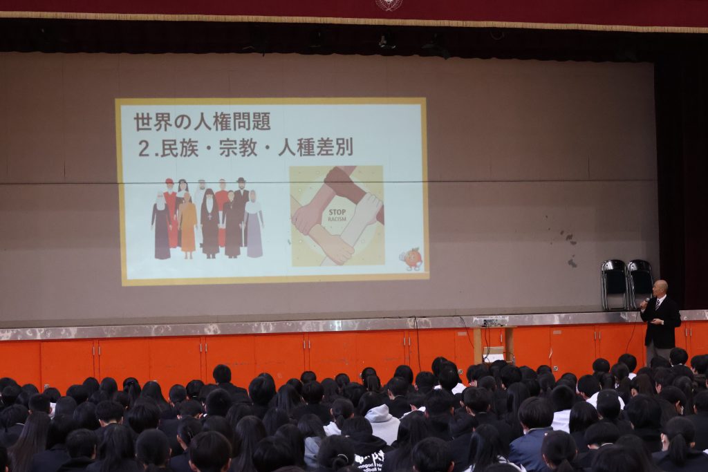 お知らせ/学校生活 人権講話 2025年12月2日 12月1日に寺澤教頭先生より人権講話をしていただきました。寺澤先生の実体験に基づく話や日常に潜む人権問題など幅広く人権についての話を聴くことができました。同じような環境で生活をしていても価値観や考え方の違いがあることを踏まえ、学校生活を送っていきたいです。