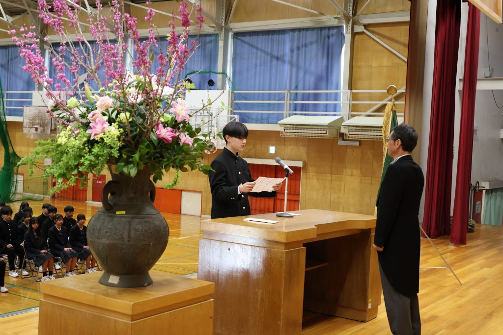 お知らせ/学校生活 入学式 2026年4月7日 4月6日(月)に入学式を挙行いたしました。春のやわらかな陽ざしのもと新入生が新たな一歩を踏み出しました。新入生一人一人が少し緊張しながらも、希望に満ちた表情で式に臨んでいました。教職員一同、新入生の皆さんの成長を全力で支えてまいります。新しい仲間との出会いを大切にし、充実した学校生活を送ってくれることを願っています。