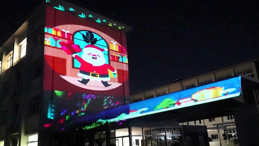 12月15日に蒲郡東高校の生徒会と愛知工科大学情報メディア学科加藤研究室が連携して、プロジェクションマッピングを行いました。本校3年生に向けて、1・2年生からの応援メッセージが送られました。また、1