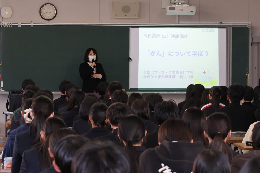 1月28日に1年生を対象として、がん教育講話を蒲郡市立ソフィア看護専門学校の酒井由貴様に行っていただきました。 「がん」は身近な病気であること、多くの人がもっているイメージと実態の違いなど、正